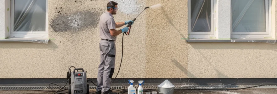 La mise en œuvre doit toutefois rester maîtrisée : on dilue généralement le détergent selon les recommandations du fabricant, puis on l’applique au pulvérisateur basse pression, en veillant à ne pas saturer le support. Un temps de contact de 5 à 15 minutes est suffisant dans la plupart des cas, sans laisser sécher le produit en surface. Un brossage doux à la brosse nylon peut compléter l’action chimique avant un rinçage abondant à l’eau claire. Vous vous demandez si un tel produit est compatible avec votre crépi acrylique ou siloxane ? C’est précisément l’objet du test de zone témoin réalisé au préalable.